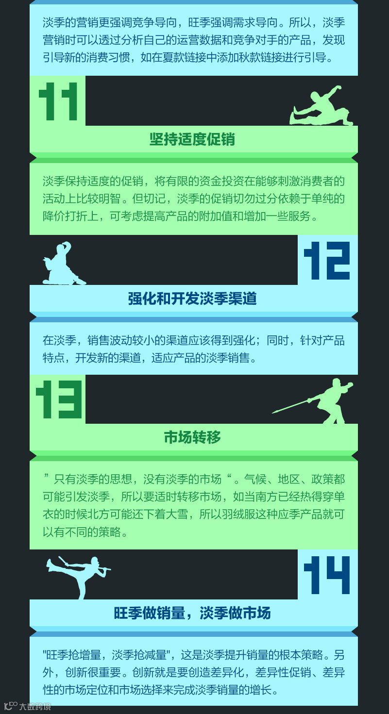 “旺季取利,淡季取势”这应该是淡季营销的核心思想。取利,就是要夺取最大销量;取势,则是获取制高点,争取长期的战略优势。所以“淡季不淡”正是这个道理,淡季并不是闲下来,而是我们要做的东西会更多!