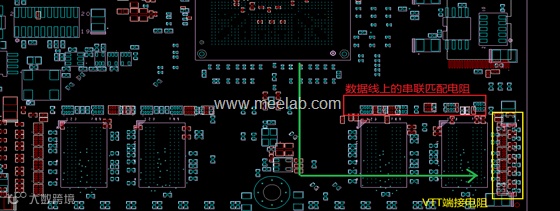 以下是带有VTT端接电阻的DDR2元器件摆放示意图,在这个例子中,没有串联匹配电阻,VTT端接电阻摆放在了地址线可以到达的最远距离。