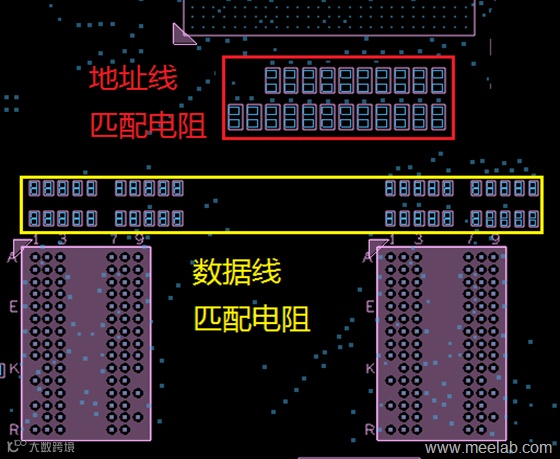 对于DDR3,地址线的等长往往需要过孔来配合,具体的规则均绑定在过孔上和VTT端接电阻上,如下图。可以看到,CPU的地址线到达过孔的距离等长,过孔到达VTT端接电阻的距离也等长。