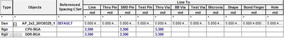 3. 线距部分主要考虑两方面,一是线-线间距,建议采用2W原则,即线间距是2倍线宽,3W很难满足;二是线-Shape间距,同样建议采用2W原则。对于线间距,也可以在Allegro中建立一种约束条件,为所有DDR走线(XNET)分配这样的约束条件,如下图。
