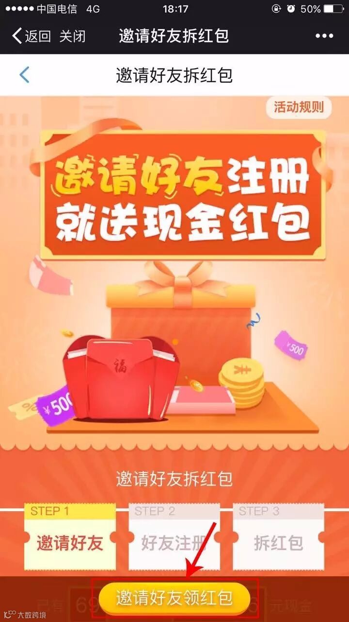 第二步:点击菜单栏后进入活动页面,点击邀请好友开始拆红包