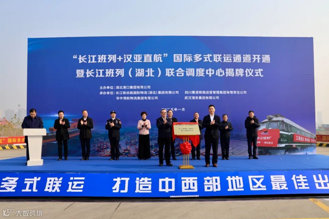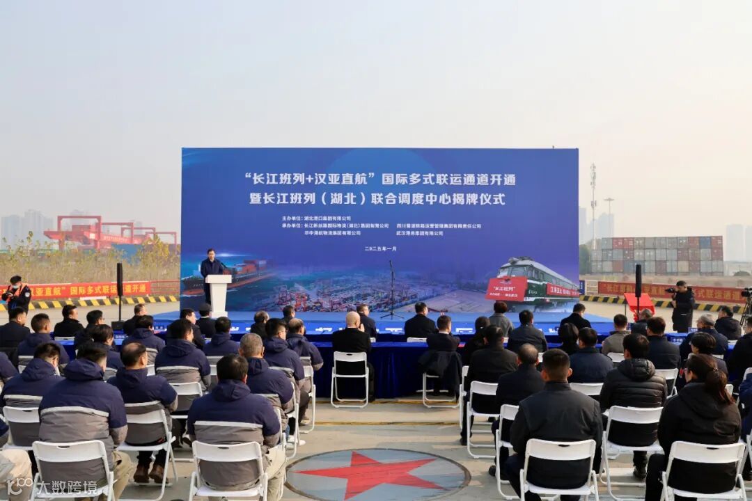 1月3日,湖北港口集团在汉举办“长江班列+汉亚直航”国际多式联运通道开通暨长江班列(湖北)联合调度中心揭牌仪式。省道路运输事业发展中心党委书记、主任曹翃、省商务厅二级巡视员唐华、中国铁路武汉局集团货运部副主任熊建、蜀道集团副总经理蒋永林出席活动并致辞,湖北港口集团党委委员、副总经理易文成宣布通道开通,湖北港口集团总工程师范礼建和四川蜀道铁路运营管理集团党委书记、董事长张锋为“长江班列(湖北)联合调度中心”揭牌,湖北出入境边防检查总站党委副书记、副总站长王仕斌出席活动。