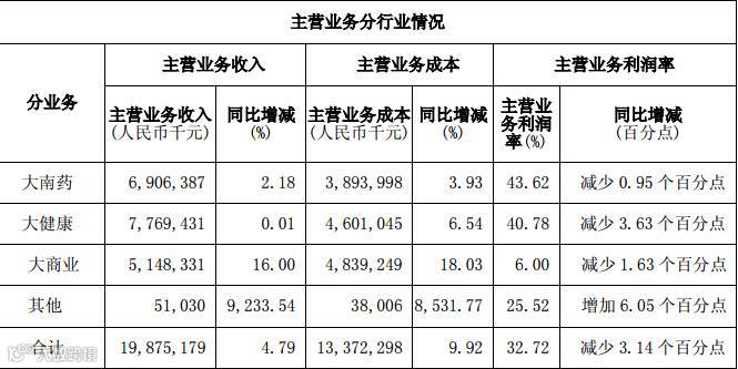白云山业务主要涉及“大南药、大健康、大商业”三大板块,2016年三大板块营收分别为69.06亿元、77.69亿元和57.48亿元。