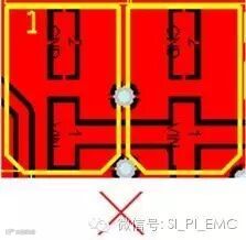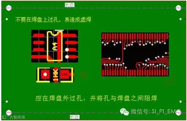 4、不要直接在焊盘上过孔:直接在焊盘上过孔的缺陷是在过回流时锡膏熔化后流到过孔内,造成器件焊盘缺锡,从而形成虚焊。如图: