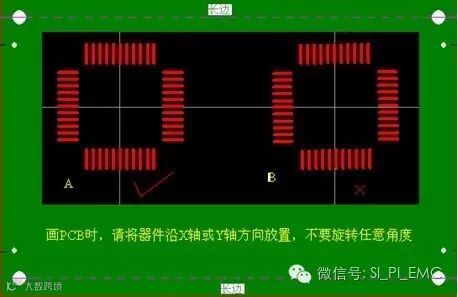9、放置器件不要旋转任意角度:由于贴片机无法旋转任意角度,只能旋转90℃、180℃、270℃、360℃。如下图B 旋转了1℃,贴片机贴装后器件管脚与电路板上的焊盘就会错开1℃的角度,从而影响焊接质量。