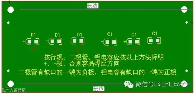 5、关于二极管、钽电容的极性标注:二极管、钽电容的极性标注应符合行规,以免工人凭经验焊错方向。如图: