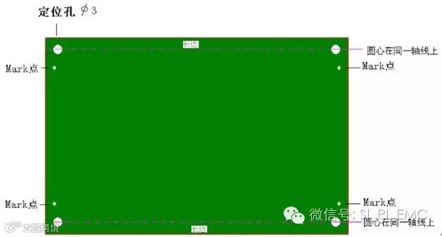 1、关于定位孔:PCB板的四角要留四个孔(最小孔径 2.5mm),用于印刷锡膏时定位电路板。要求X轴或Y轴方向圆心在同一轴线上,如下图: