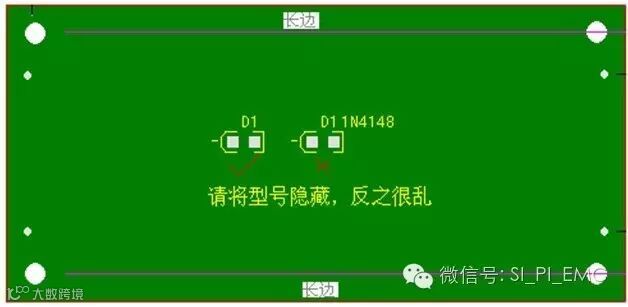 6、关于丝印和标识:请将器件型号隐藏。尤其是器件密度高的电路板。否则,眼花缭乱影响找到焊接位置。如下图:
