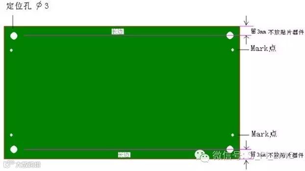3、关于留5mm边:画PCB时,在长边方向要留不少于3mm的边用于贴片机运送电路板,此范围内贴片机无法贴装器件。此范围内不要放置贴片器件。如图: