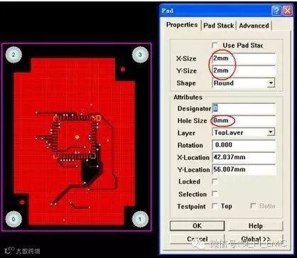 2、关于Mark点:用于贴片机定位。PCB板上要标注Mark点,具体位置:在板的斜对角,可以是圆形,或方形的焊盘,不要跟其它器件的焊盘混在一起。如果双面有器件,双面都要标注。