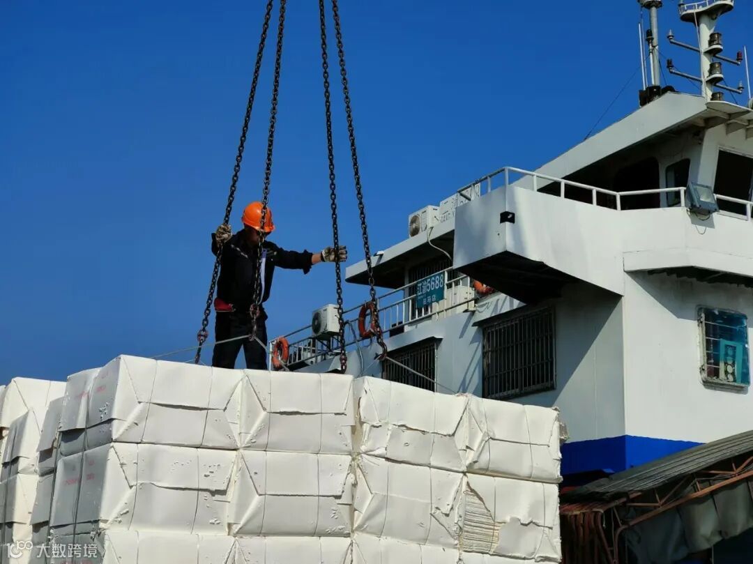 港运公司,四唯港区装卸组员工正在进行木漿装卸作业。