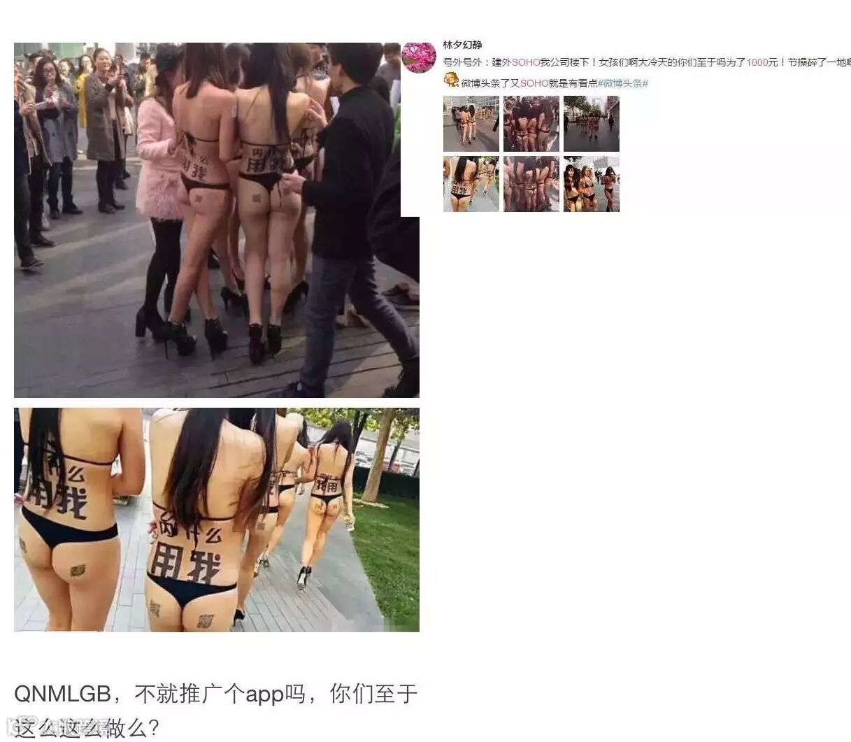 也会记得这个被北京朝阳区大妈组织的集体裸奔事件。一群大好的姑娘,为了1000元人民币,奔走在十一月的严寒里。只是那个苦逼的幕后策划者,虽然是吸引了消费者的眼球,但在关键部位被打了马塞克,又没有后续的手段,不能象金立那样,引起国内大佬的兴趣,是白花了一笔冤枉钱。
