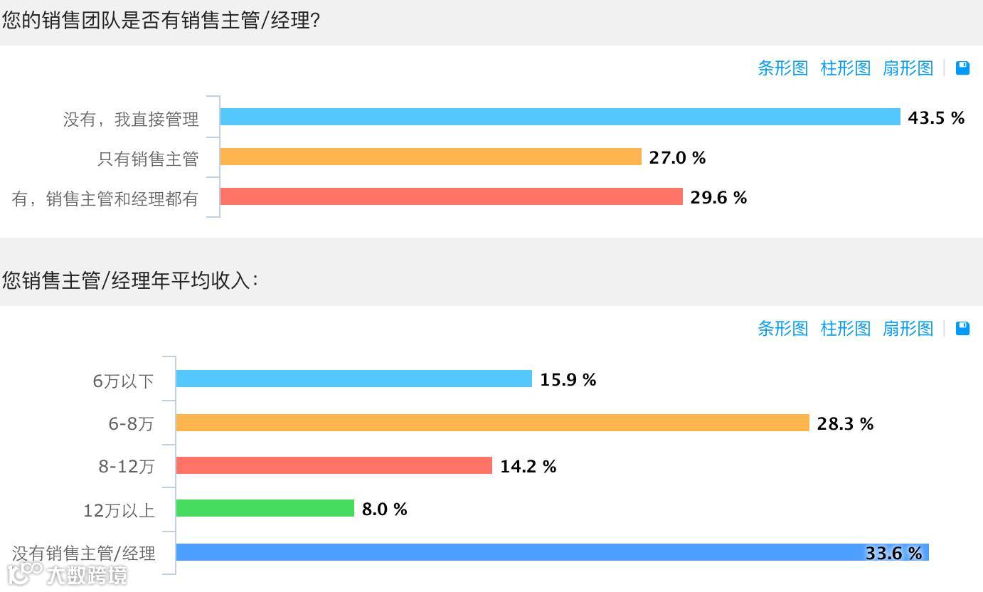 本次调查中,44%的经销商表示没有聘用销售主管/经理,是由自己直接管理。 而56%的经销商,除了业务人员的工资费用,还要承受销售主管/经理的工资费用。其中,就大部分的表现来看,一个销售主管/经理每个月的平均工资在5000元-6700元之间。
