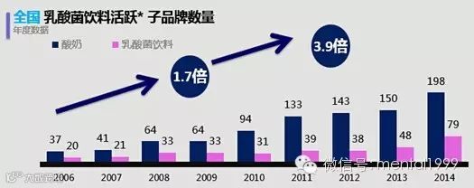 越来越多的厂商,开发出越来越多的产品,参与到乳酸菌饮料市场的竞争。2014年常温乳酸菌品牌数量相比八年前增长3.9倍,2014年常温乳酸菌饮料品牌高达79个(在商超中有销售,且年销售额份额在一定规模以上)。