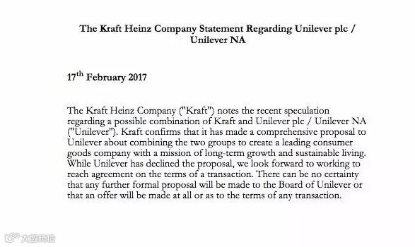 卡夫亨氏公示注意到最近有关卡夫和联合利华可能合并的传言。卡夫确认,公司向联合利华提出了一个全面建议,该建议提议合并两个集团以缔造一个领先的、以长期增长和可持续生活为使命的消费品公司。尽管联合利华已经拒绝了提议,我们依然期望能一起合作就交易达成协议。并不保证会向联合利华董事会提出下一步的正式提议,也不保证会达成任何交易协议。