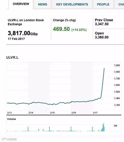 与此同时,我们也可以从以上声明了解,联合利华拒绝了卡夫亨氏的提议,但是受到消息刺激,联合利华的股价目前上涨到了历史新高,先是从33.60英镑大幅跳涨到37英镑或涨幅11%,目前已经涨幅超过14%。这样一来,联合利华的市值超过了1000亿英镑。