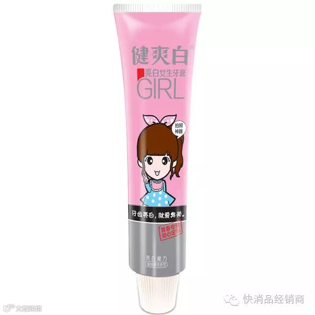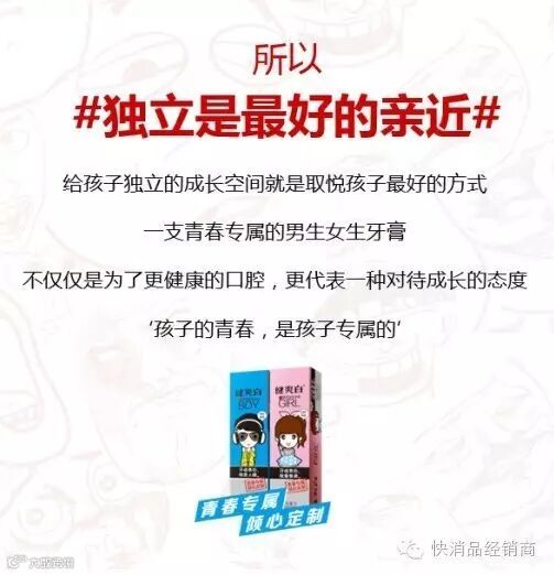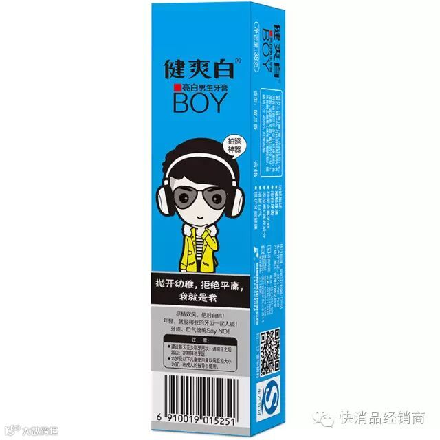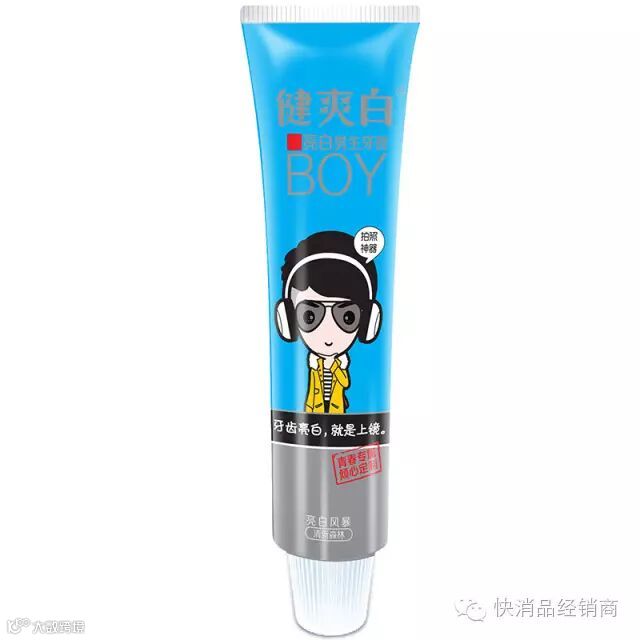 俗话说,快消品是货卖一张皮。为了更好与年轻人沟通,健爽白男生女生专属牙膏在第一视觉上就采用了青少年喜欢的卡通包装。超级清晰的卖点以及年轻人喜爱的的标语,是获得年轻粉丝喜爱的法宝。
