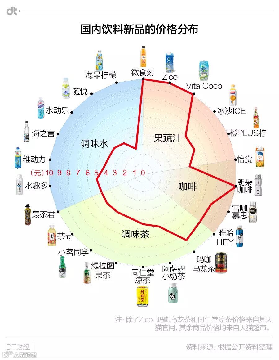 即饮咖啡和果蔬汁普遍价位较高,调味茶其次,最后是调味水——价位在4元左右,只是咖啡类的一半。