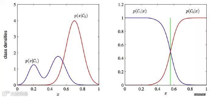 为什么判别式学习比产生式更加简单:PRML 图1.27.这两类方法的分类条件的密度举例,有一个单一的输入变量x(左图),连同相应的后验概率(右图)。注意到左侧的分类条件密度p(x|C1)的模式,在左图中以蓝色线条表示,对后验概率没有影响。右图中垂直的绿线展示了x中的决策边界,它给出了最小的误判率。