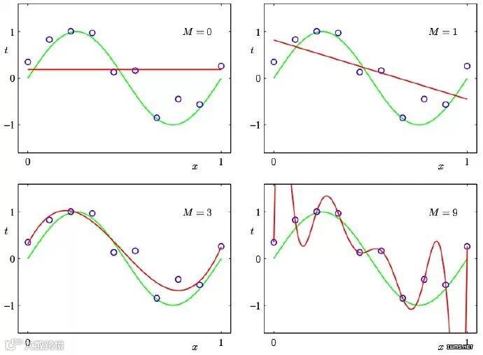 2. Under nd overfitting: 低度拟合或者过度拟合的例子。PRML 图1.4.多项式曲线有各种各样的命令M,以红色曲线表示,由绿色曲线适应数据集后生成。