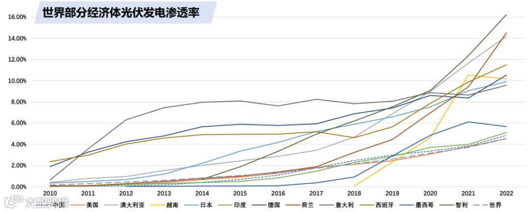 2023年,我国光伏产业规模持续扩大,多晶硅、硅片、电池、组件等主要制造环节产量同比增长均超过64%,行业总产值超过1.75万亿元。目前,世界主要经济体光伏渗透率不断提升,特别是近五年增速较快,2022年世界平均光伏发电渗透率约为4.54%。中美渗透率与世界平均水平较为接近,分别为4.83%和4.53%,但存在较大提升空间,光伏产业未来需求仍是不可估量的。
