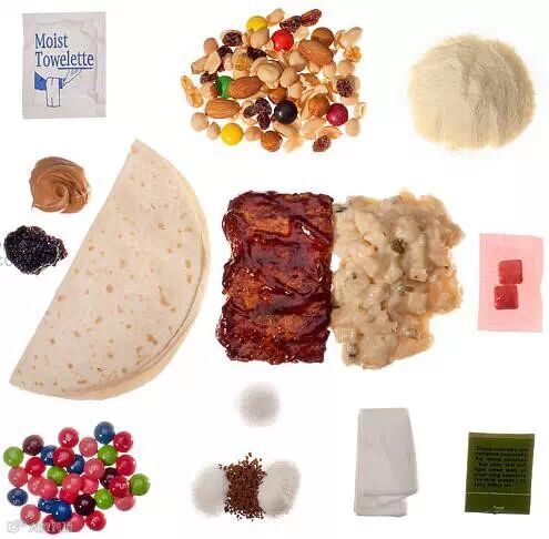 MRE单兵标准 猪肉排,烤肉汁,玉米饼,土豆浓汤,黑莓酱,奶油花生,士力架,坚果葡萄干,口香糖,糖,速溶咖啡,奶油,速溶柠檬粉,盐巴,湿巾,纸巾,火柴