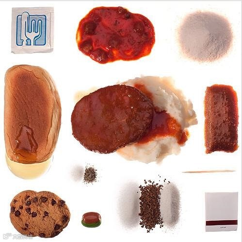 陆军标准作战口粮 酱汁肉丸,金枪鱼,热巧克力粉,速溶咖啡,茶包,糖,盐巴,辣椒粉,牙签,湿巾,海绵