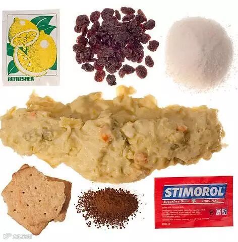 军队军粮 奶油马铃薯炖鳕鱼,燕麦饼干,葡萄干,能量饮料,速溶咖啡,口香糖,湿巾