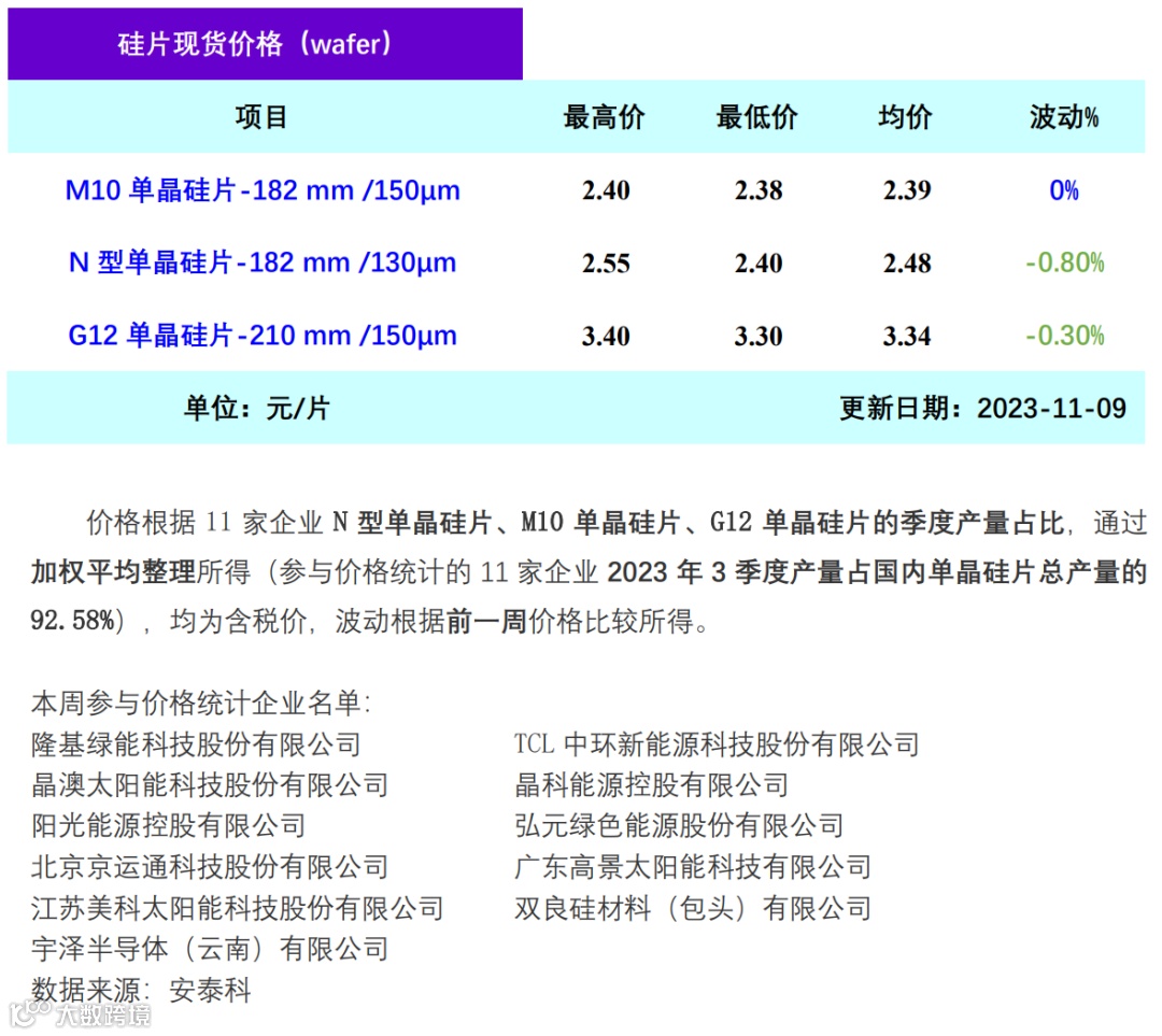 导读:11月9日,硅业分会公布本周单晶硅片最新价格。