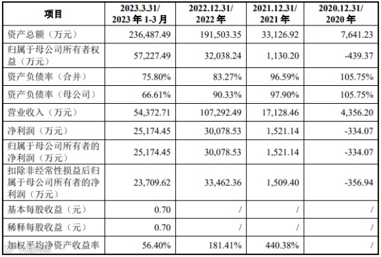 招股书显示,在2020-2022年度及2023年一季度,该公司营业收入分别为4356万元、1.71亿元、10.73亿元和5.44亿元;归母净利润分别为-334万元、1521万元、3.01亿元和2.52亿元。