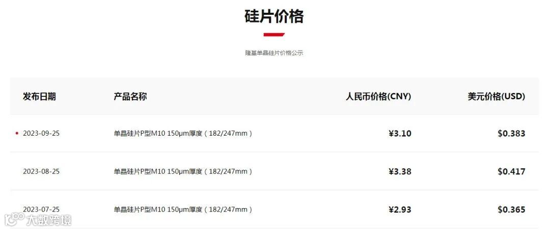 9月25日,隆基单晶硅片价格公示,单晶硅片P型M10 150μm厚度价格由3.38元人民币下调至3.10元,降幅为8.3%。