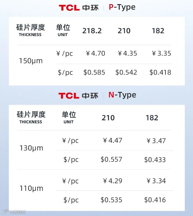 9月26日,TCL中环公示本期单晶硅片价格。与最近一次8月21日调价相比: