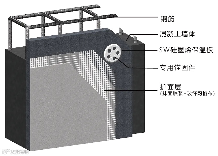 该系统是在外墙混凝土浇筑前,将免拆复合保温模板用作现浇部位的外侧模板,预置锚栓机械固定,浇筑后混凝土与免拆复合保温模板结合为一体,外侧设置找平层、抹面层和饰面层,构成的外墙外保温系统。