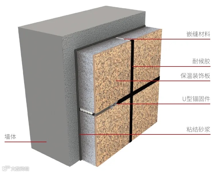 该系统是由保温装饰板、粘结砂浆、锚固件和密封胶等组成,采用粘结和锚固的固定方式,置于建筑物外墙外侧的保温装饰一体化系统。