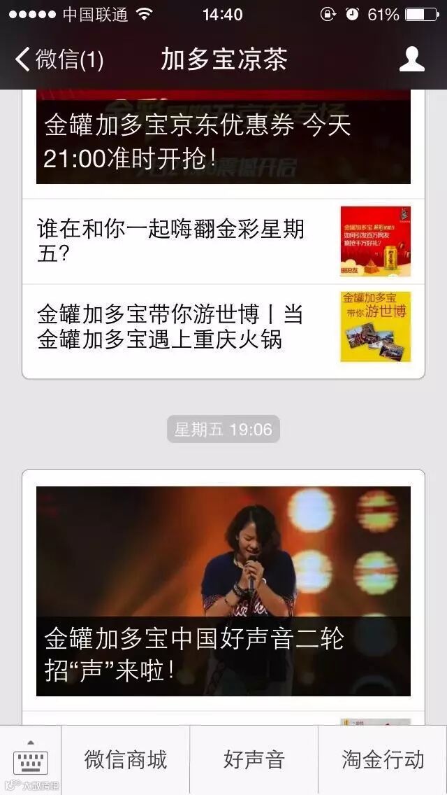 当然加多宝不会利用这样优质的资源为别人打广告,除了每日内容的推荐之外,加多宝利用了微公众号下的三个自定义菜单栏,分别放上微信商城、好声音和淘金行动三大入口,意在全方位整合资源。