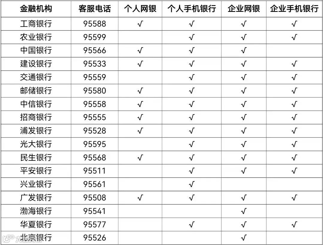 ◎手机银行APP:工商银行、农业银行、建设银行、交通银行、招商银行、浦发银行、广发银行、平安银行、民生银行、中信银行、光大银行、邮储银行。