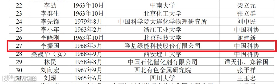 “化工、冶金与材料工程学部”共71人候选,其中,隆基绿能李振国在列。