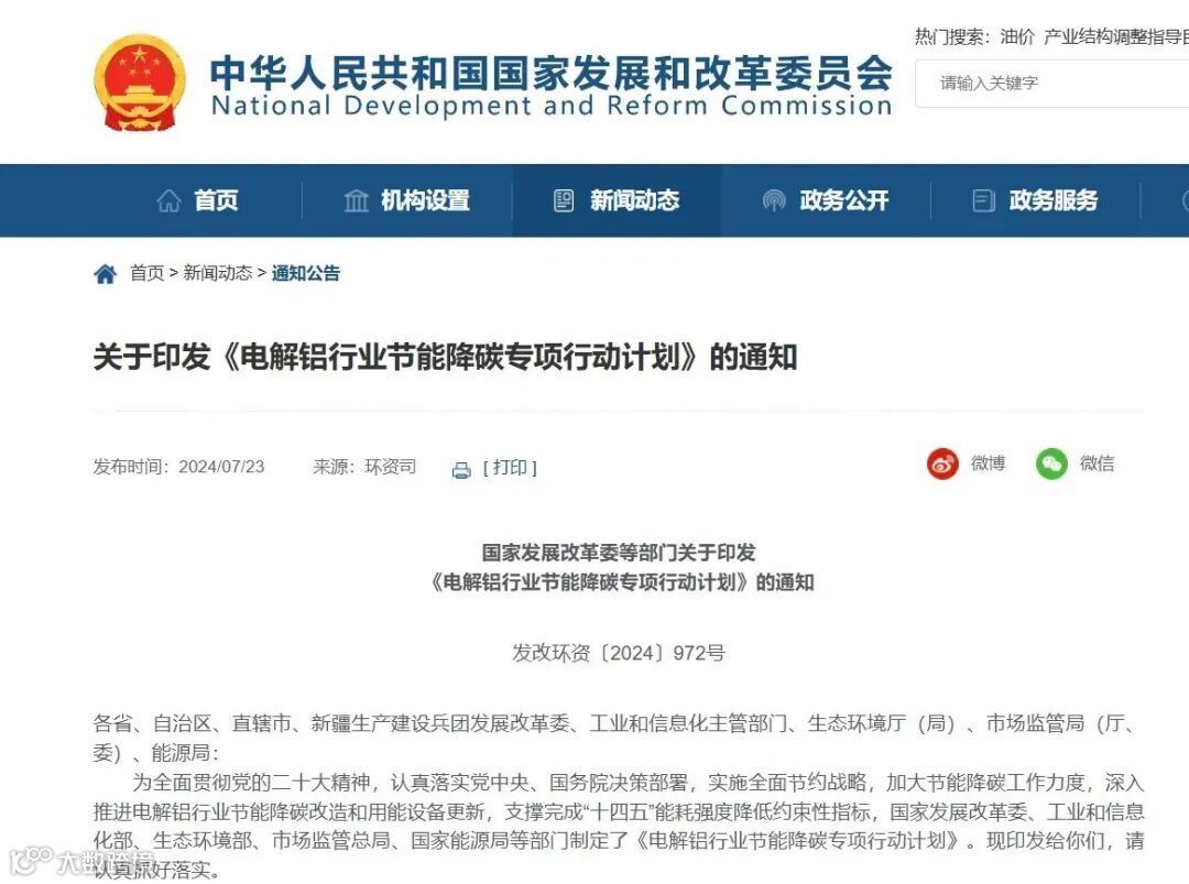 7月23日,国家发改委等五部门联合发布《电解铝行业节能降碳专项行动计划》(以下简称《计划》)的通知。表示积极支持电解铝企业扩大风电、光伏等非化石能源应用。