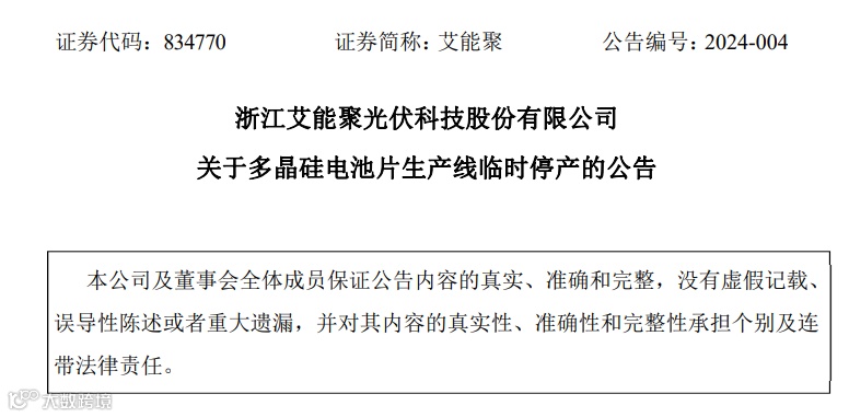 艾能聚发布公告称,受技术迭代及市场需求影响,为减少损失及整体经营业绩的角度考虑,经公司管理层讨论决定,近期对公司多晶硅电池片生产线实施临时停产,停产时间至2024年3月31日,后续复产情况视未来市场需求订单情况而定。