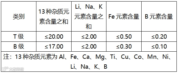 我国对石英原料纯度一般是以Al、Fe、Ca、Mg、Ti、Cu、Co、Mn、Ni、Li、Na、K、B13种有害元素来衡量的,要求它们的总和要小于20×10-6,半导体级石英坩埚13种杂质元素含量之和小于17ppm。