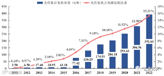 根据中国电力企业联合会数据,我国光伏发电装机容量占全部电源装机总容量的比例,由2011年的0.24%快速提升至2022年的15.31%;2011-2022年,我国光伏发电累计装机容量年均复合增长率高达58.36%。截至2022年末,国内光伏发电累计装机容量