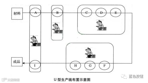 U型布置是柔性生产和精益生产中经常采用的一种方式,U型生产线布置示意图,如下图所示。