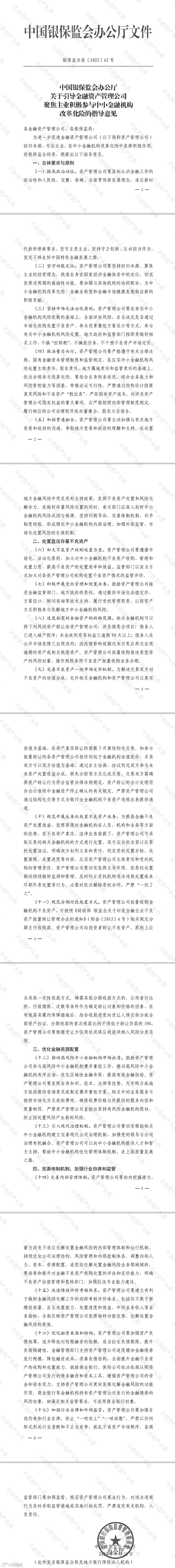 导读:文章来源丨银保监;银保监会《关于引导金融资产管理公司聚焦主业积极参与中小金融机构改革化险的指导意见》(以下简称