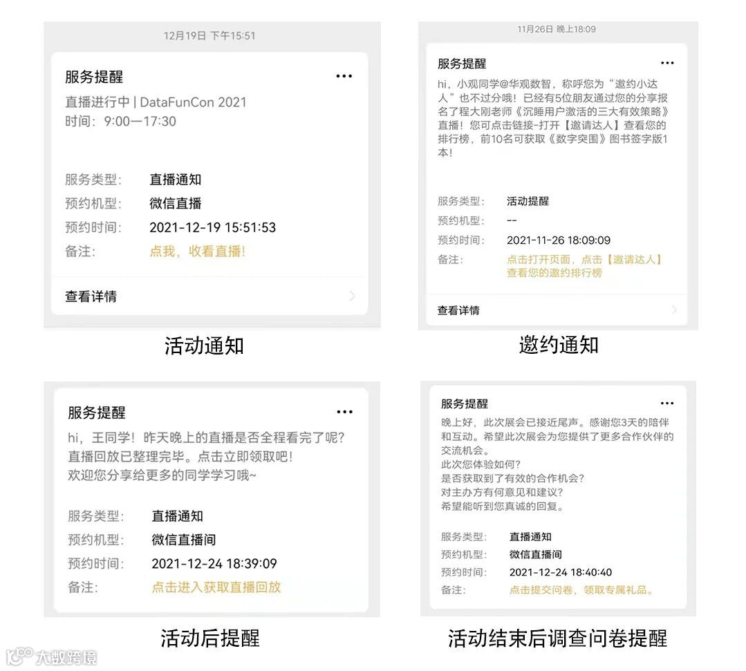 活动前,可向报名用户发送活动时间和注意事项的通知;活动当天,可以通知当天活动进程;活动完成后,可发放调查问卷;围绕活动主线,可以实现多重推送通知的运营触点。
