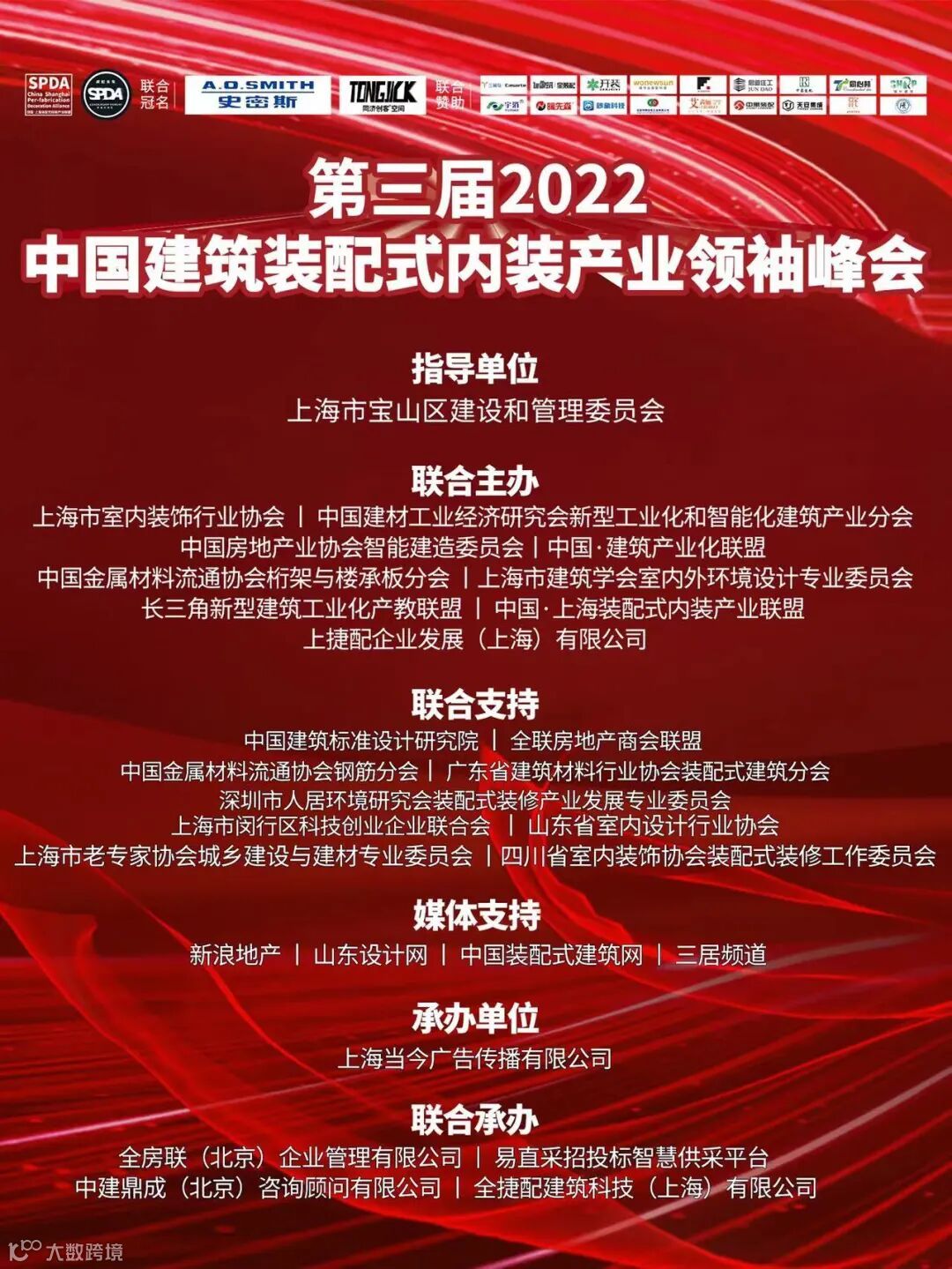 8月18日,由上海市室内装饰行业协会、中国建材工业经济研究会新型工业化和智能化建筑产业分会、中国房地产业协会智能建造委员会中国·建筑产业化联盟、中国金属材料流通协会桁架与楼承板分会(装配式建筑分会)、上海市建筑学会室内外环境设计专业委员会、长三角新型建筑工业化产教联盟、上捷配企业发展(上海)有限公司联合支持主办,易直采招投标智慧供采平台、全房联(北京)企业管理有限公司、中建鼎城(北京)咨询顾问有限公司、当今广告等机构承办的“第三届2022中国建筑装配式内装产业领袖峰会”暨新型装配式材料展示交流会在上海胜利召开。