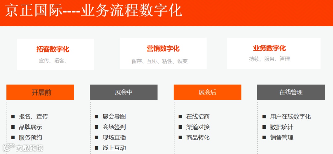 决定做“数字化转型”之后,邓总就开始找做数字化转型的服务机构,一次偶然的机会,邓总听到了“数字化大咖说”的课程备受启发,接着就联系到华观数智,希望可以帮助他们搭建数字化平台,经过与华观数智产品经理多次沟通之后,华观数智帮助京正搭建了涵盖展会推广-报名-用户裂变-到场核销-到场消费-会后数据统计的全链路解决方案,助力京正通过数字化的手段实现线上线下一体化,高效提升业务发展。