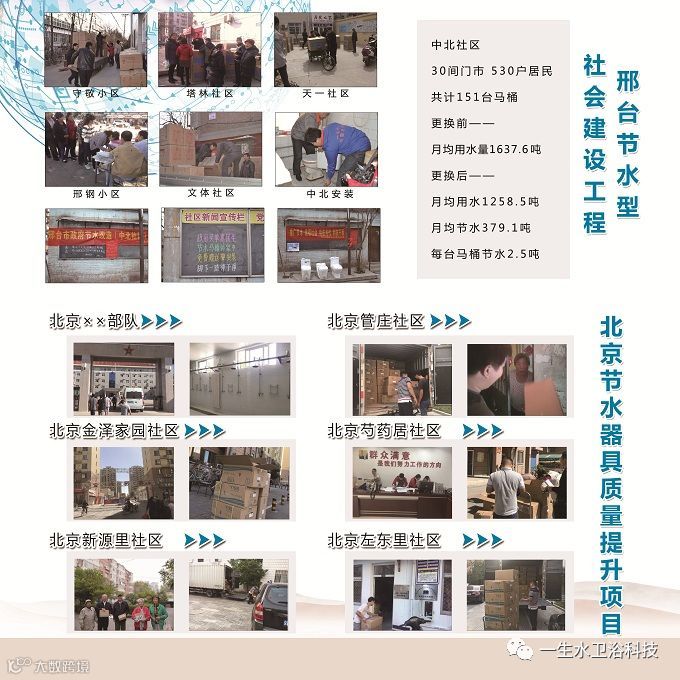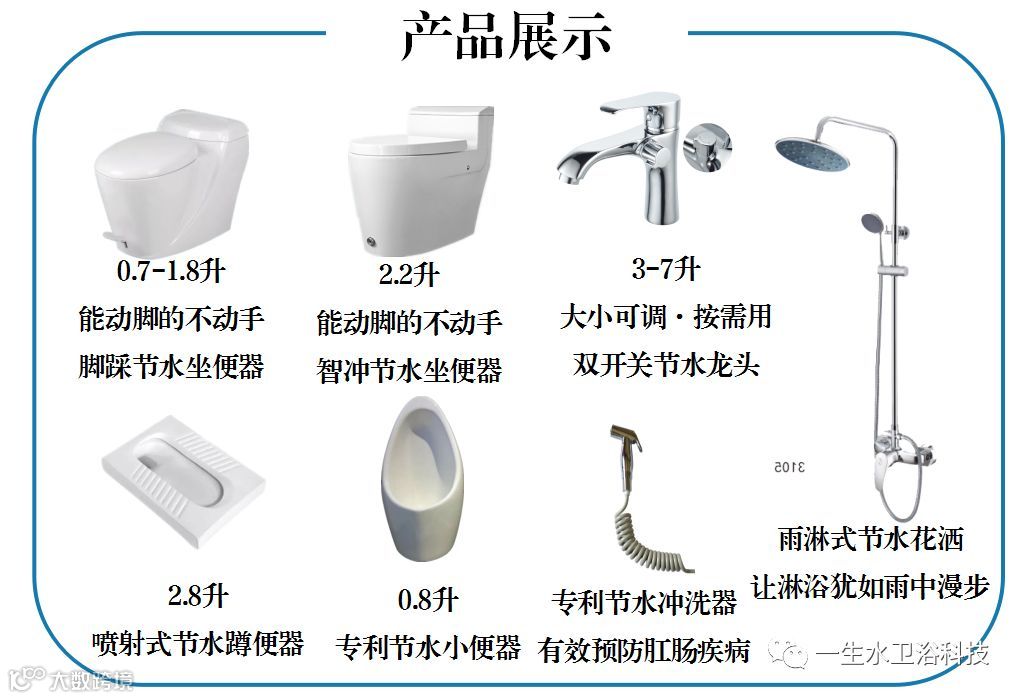 一生水自主研发了节水坐便器、节水蹲便器、节水龙头、空气能节水花洒、节水冲洗器、节水小便器六大系列节水器具。一生水的节水新技术、新产品,在国标基础上还可以节水50%左右,可以为城市、为国家、为人类节约50%的生活用水。