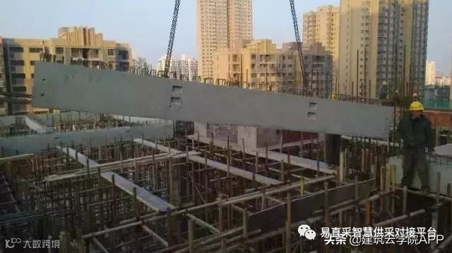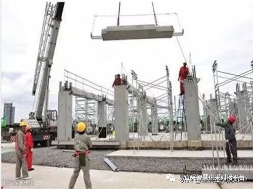 以预制框架结构为例,一层施工完毕后,先吊装上一层柱子,接着上主梁、次梁、楼板。预制构件吊装统统结束后,就开始绑扎连接部位钢筋,最后进行节点和梁板现浇层的浇筑。