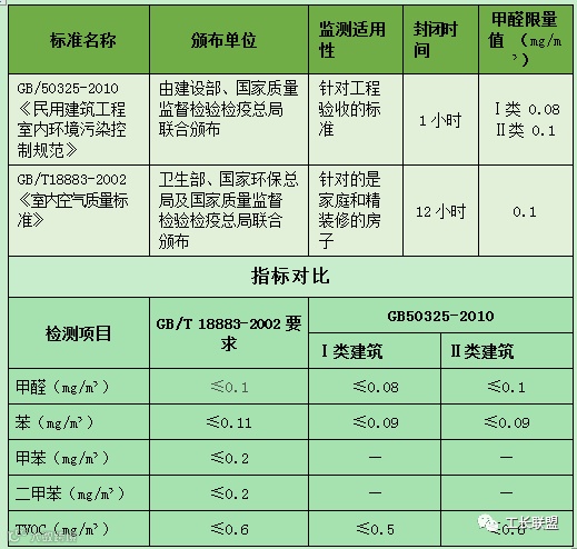 可以看出,两个标准甲醛、苯、TVOC数值很接近,但封闭时间却相差太大。室内空间封闭后,各种装修材料在不停地释放污染物,释放1小时跟12小时将会有多大的差异,各位可以自己去想一下。我们用一个简单的表来对比一下这两个标准: