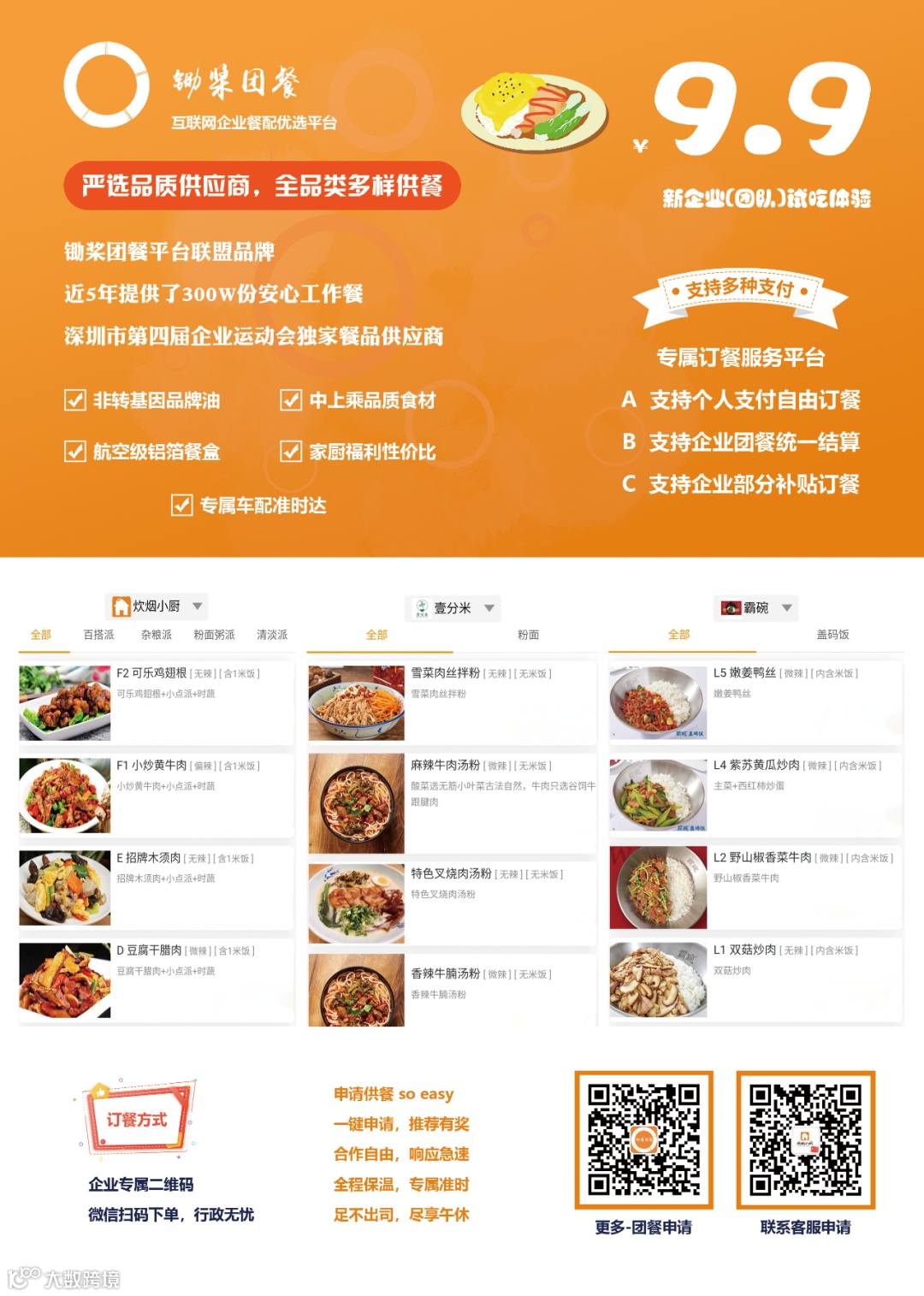 企业级优选供餐平台~企业级更高质、更安心的保障,透明化展示厨房、食材,支持个人支付、企业结算、部分补贴,全线上微信自主下单,行政无忧,专车专属配送准时达,更有早餐、正餐附加靓汤等定制化搭配,企业级才是安心选择!